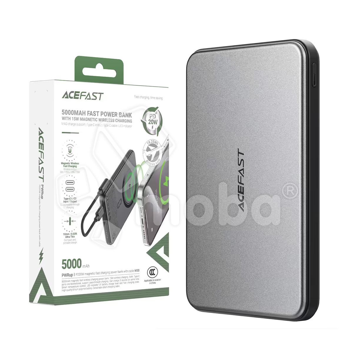 Power Bank оснащён батареей ёмкостью 5000 mAh, что позволяет подзаряжать смартфоны, наушники и другие гаджеты на ходу. Он поддерживает быструю проводную зарядку 18 W через порт Type C, а также оснащён беспроводной магнитной зарядкой MagSafe 7.5 W, которая обеспечивает удобное и надёжное беспроводное подключение совместимых устройств (например, iPhone с поддержкой MagSafe).